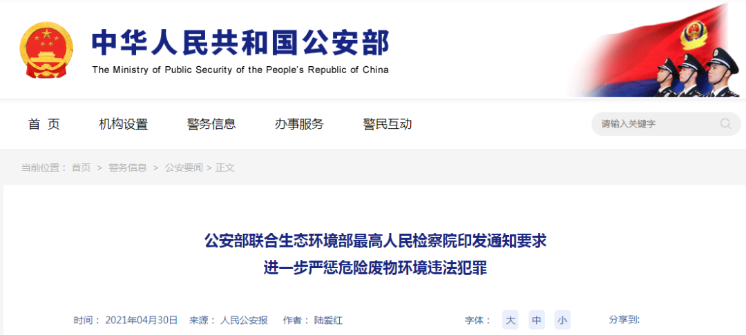 日前,公安部会同生态环境部、最高人民检察院联合印发通知要求,即日起在全国集中开展为期6个月的严厉打击危险废物环境违法犯罪和重点排污单位自动监测数据弄虚作假违法犯罪专项行动。通知明确了此次专项行动的打击重点是依法严厉打击非法收集、利用、处置废矿物油以及跨行政区域非法排放、倾倒、处置危险废物等环境违法犯罪行为,以及依法严厉打击以篡改、伪造监测数据为主要手段逃避生态环境监管的违法犯罪行为。